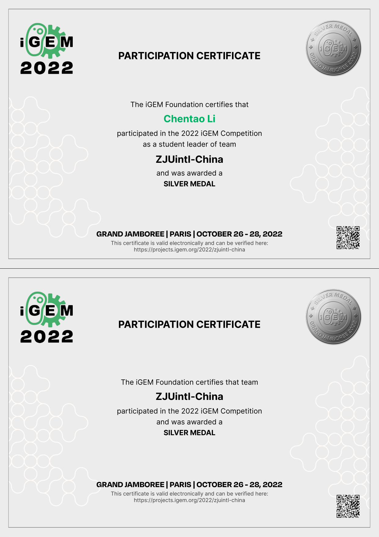 - 2022.10 Silver Prize of the International Genetically Engineered Machine Competition (iGEM). [Certificates]