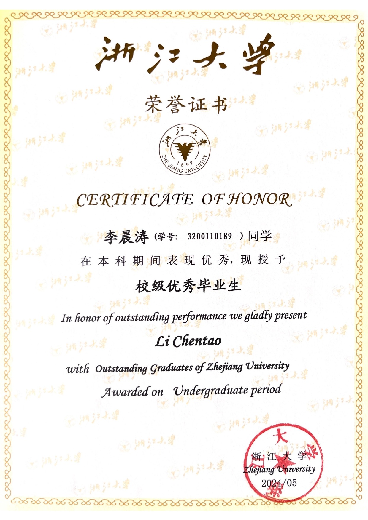 - 2024. 6 Outstanding undergraduate graduates of Zhejiang University. [Certificates]